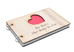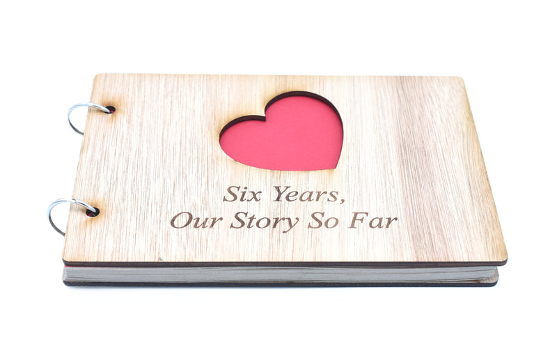 The scrapbook is bound with a quality wooden cover at the front and the back, the front cover has a heart cut out with the inscription laser engraved “Six Years, Our Story So Far”.