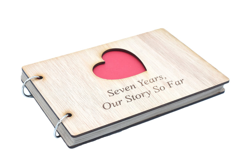 The scrapbook is bound with a quality wooden cover at the front and the back, the front cover has a heart cut out with the inscription laser engraved “Seven Years, Our Story So Far”.