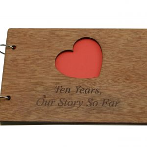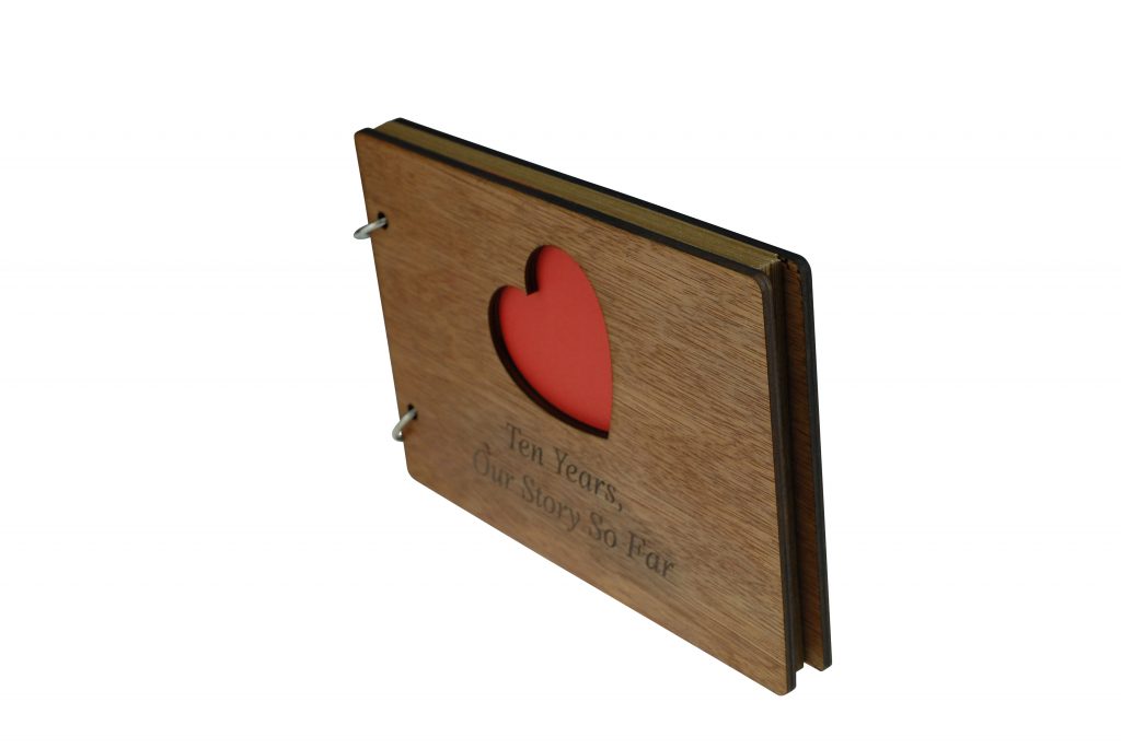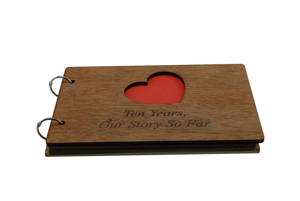 The scrapbook is bound with a quality wooden cover at the front and the back, the front cover has a heart cut out with the inscription laser engraved “Ten Years, Our Story So Far”.